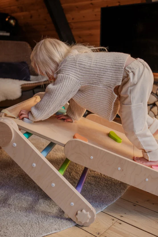 Ein verstellbares Klettergerüst oder ein Kletterdreieck sind das perfekte Trainings- und Spielspielzeug. Das HappyMoon-Kletterdreieck oder das faltbare Leiterdreieck ist als Starterset konzipiert, um Grobmotorik, Gleichgewichtskontrolle, Mut und vieles mehr zu entwickeln. Die Kletterleiter oder das Stufendreieck sind nach den Prinzipien von Waldorf-Spielzeug und Montessori-Möbeln gestaltet. Das Baby Climber Gym für Kleinkinder ist das perfekte Geschenk.