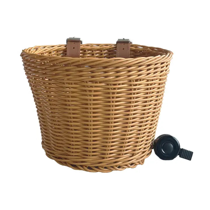 Schöner, langlebiger Korb aus Kunststoffgeflecht mit universeller Klingel. Korbmaterialien: 95% Kunststoffrattan, 5% Polyurethan. Klingelmaterialien: 53% Nylon, 47% Aluminium. Beutelmaterialien (Verpackung): 100% Baumwolle.