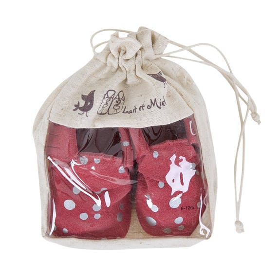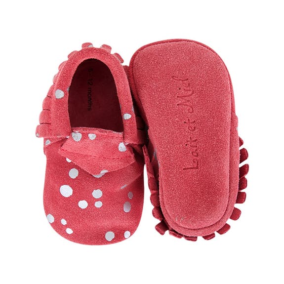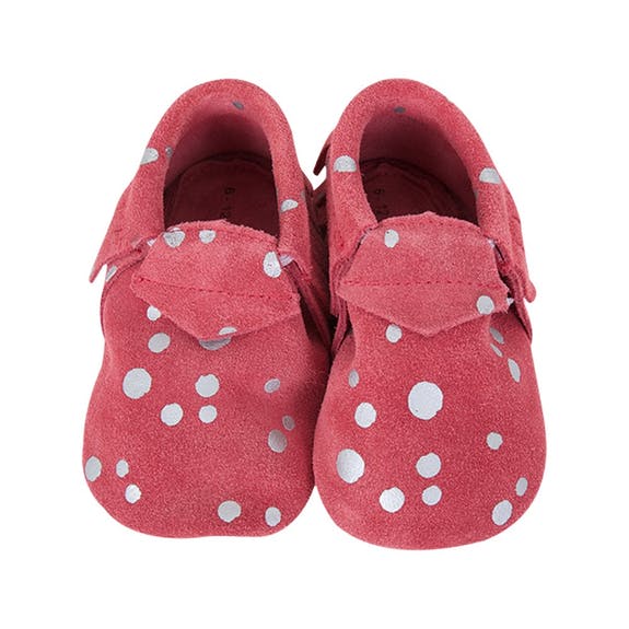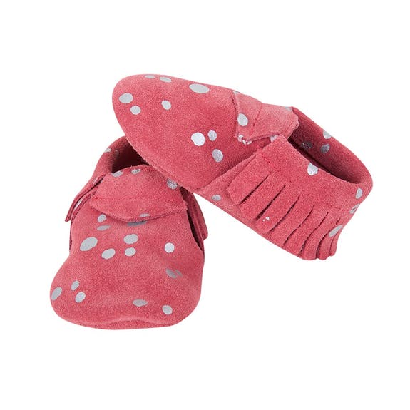 Dieses Modell von Baby-Mokassin-Hausschuhen ist sehr charmant und mit lustigen kleinen silbernen Punkten versehen!